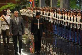Lors de brèves déclarations à la presse, le leader bolivien a félicité Diaz-Canel pour sa récente élection en tant que président des Conseils d´État et des Ministres, puis a souligné la solidarité de la plus Grande des Antilles envers de nombreux peuples du monde.