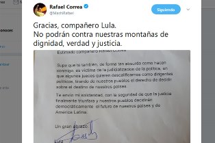 “Camarade Lula”, répond Correa à l’ancien président du Brésil, “ils peuvent mettre nos corps en prison. Pas nos idéaux!!! Nous vaincrons!”, avant d’ajouter, dans le même tweet, combien sa foi reste inébranlable en cette victoire finale de la justice qui permettra aux peuples d’Amérique Latine de décider de leur avenir démocratiquement.