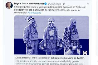 La Havane, 6 janvier (Prensa Latina) Le président cubain Miguel Diaz-Canel a partagé aujourd’hui sur Twitter un article sur l’opération du putschisme bolivien sur ce réseau social qui démontre la manipulation sur le sujet.