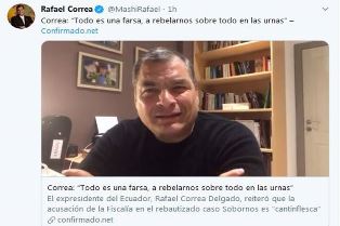 ‘Tout est une grande farce’, a-t-il insité en appelant à la révolte dans les rues et surtout dans les urnes, lors des prochaines élections de 2021, pour lesquelles il a appelé à voter pour la liste 5 du Mouvement Revolucion Ciudadana (Révolution Citoyenne).