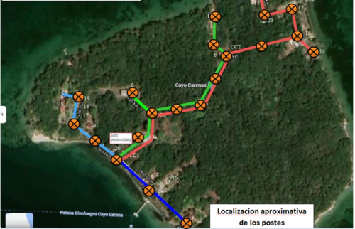 Après plusieurs études dont l’une menée en collaboration avec l’Université de Cienfuegos, la construction d’un vrai réseau électrique en câble isolé avec une solution mixte composée d’une mini-centrale photovoltaïque jumelée à un groupe électrogène a été finalement validée.