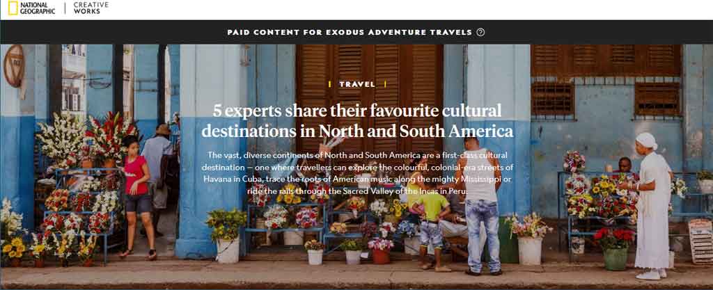Sur la liste de ses cinq voyages recommandés, l’île des Caraïbes est suivie par le Pérou; le Sud profond, en référence à un voyage à travers les villes qui bordent le légendaire fleuve Mississippi, aux États-Unis; suivis par le Mexique et la Colombie.